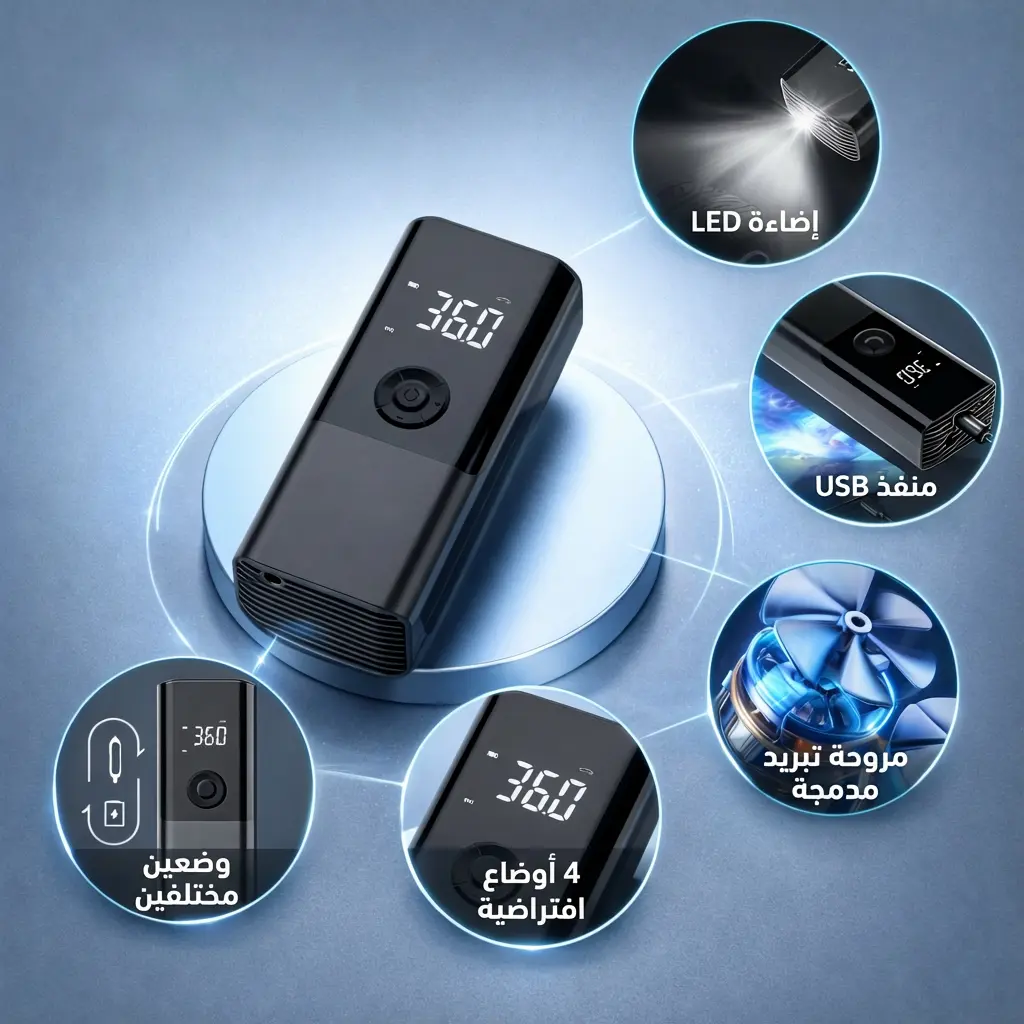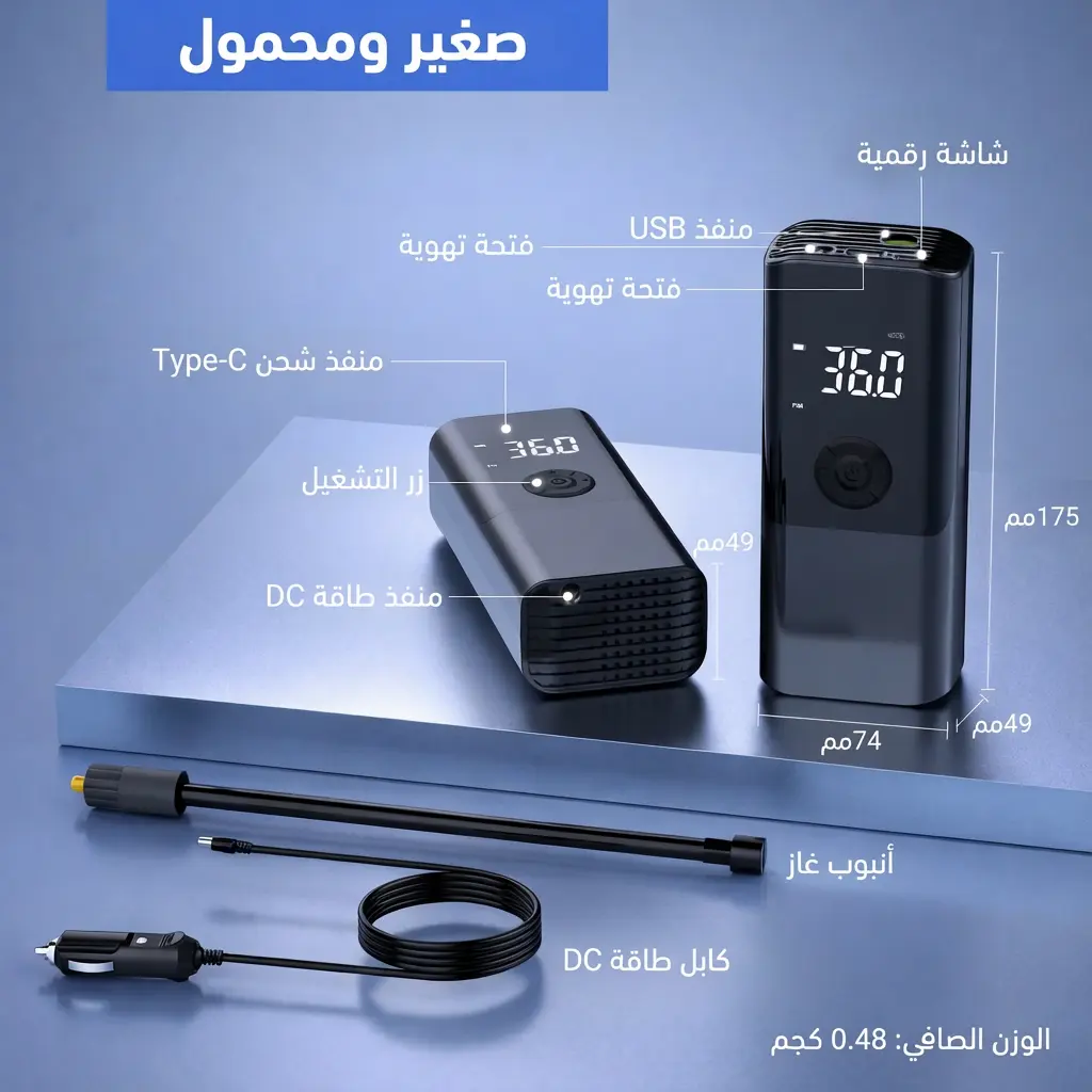 مضخة الهواء الكهربائية المحمولة هي الحل الأمثل - صغيرة الحجم، قوية الأداء، وسهلة الاستخدام. نفخ إطارات سيارتك، دراجتك، أو حتى كرة القدم في دقائق معدودة بدون جهد.